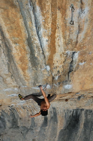 Nico starting the crux moves of Energia Positiva, 7c+.